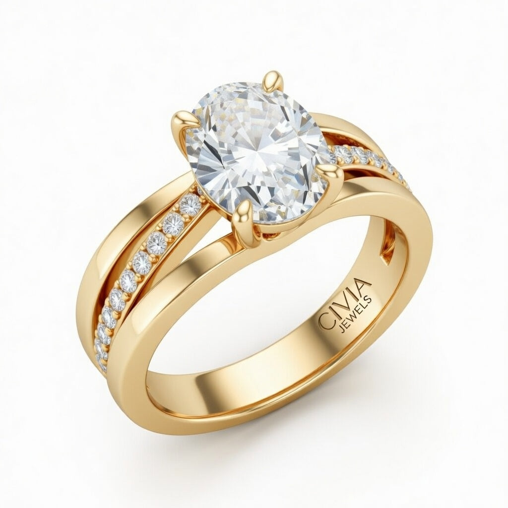 Yellow Gold Oval Brilliant Engagement Ring With Split Bypass Pavé Diamond Shank