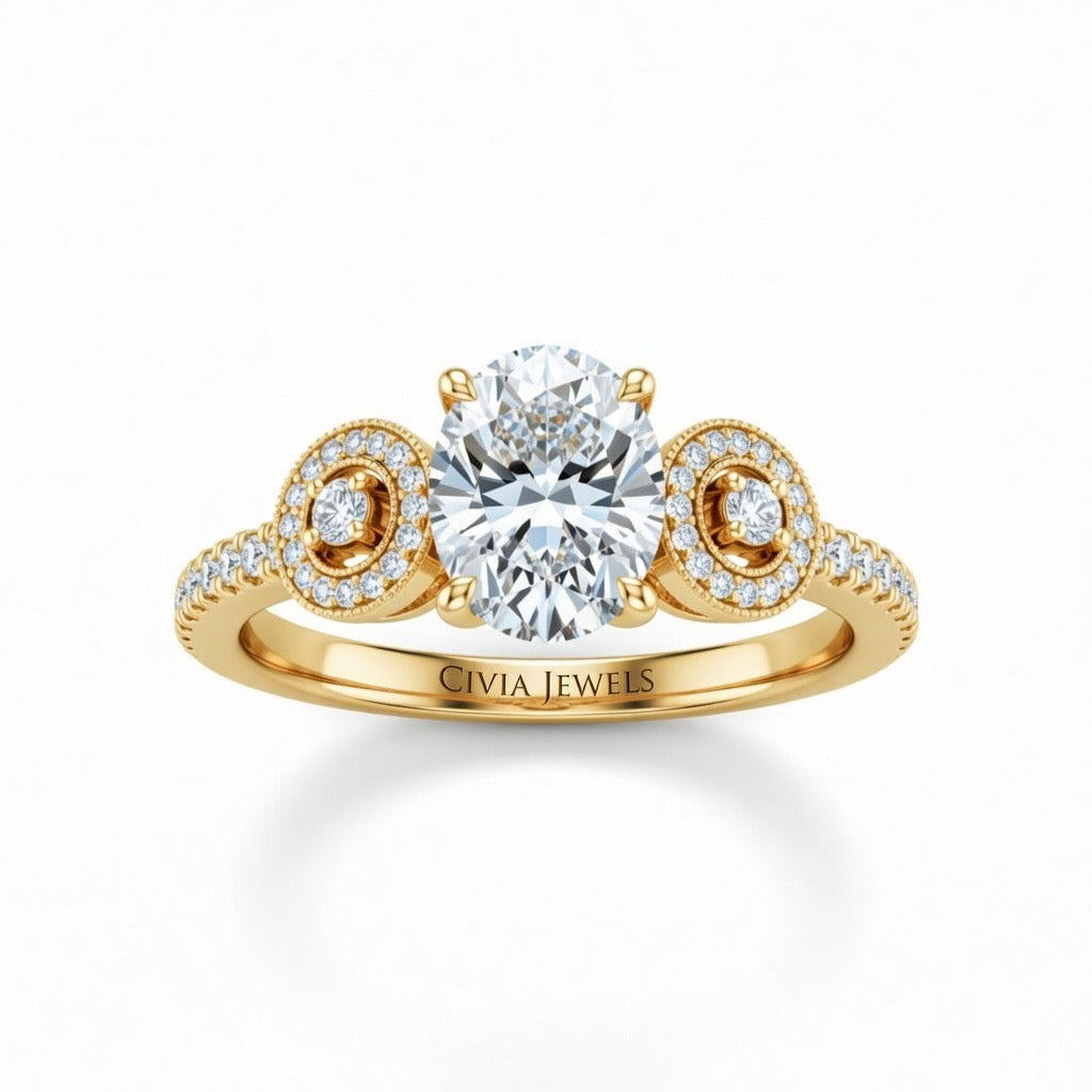Yellow Gold Oval Brilliant Three Stone Halo Engagement Ring With Vintage Milgrain Detail