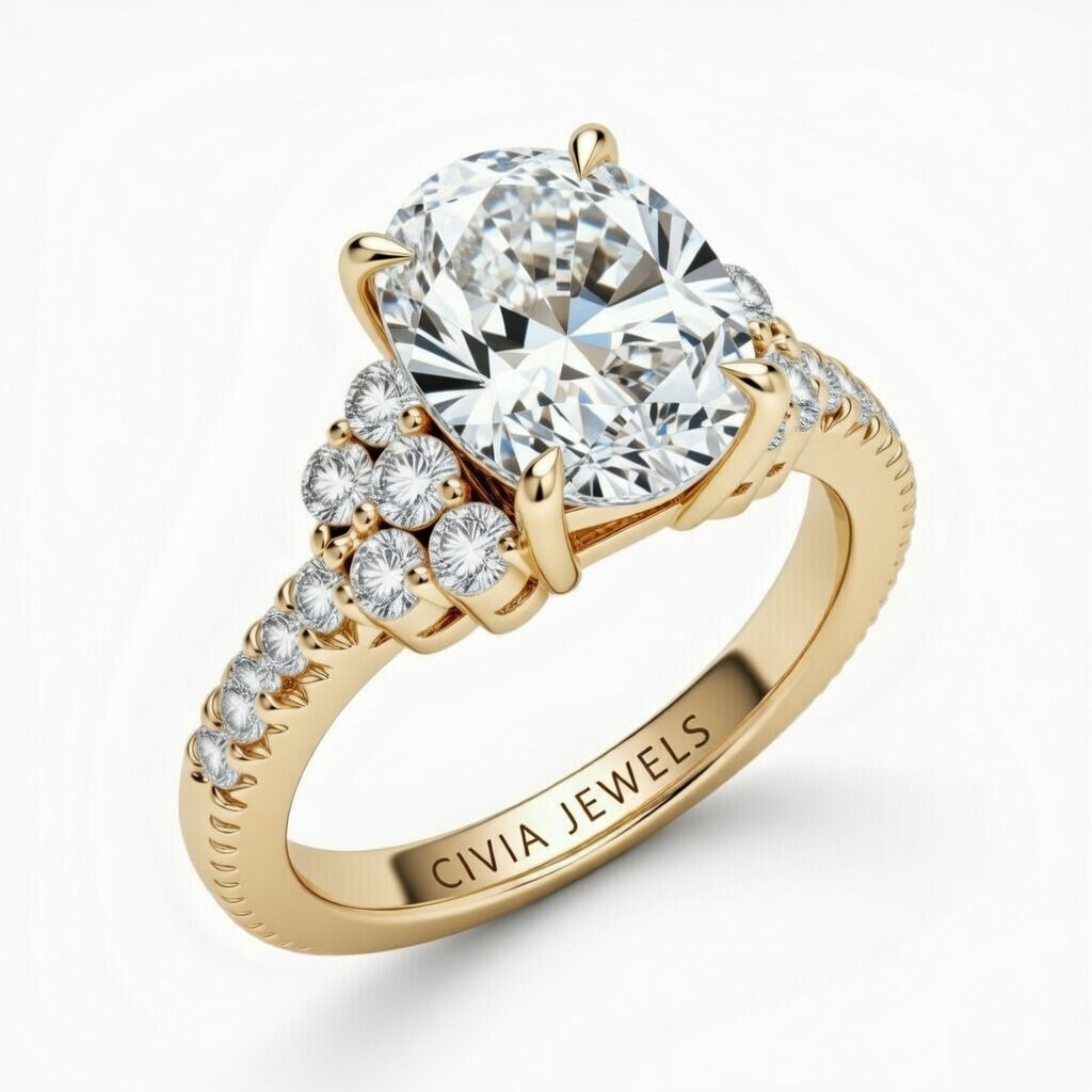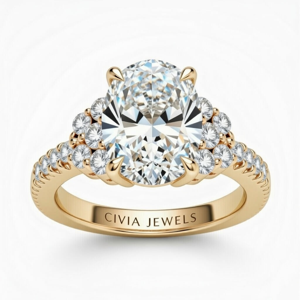 Yellow Gold Oval Cut Engagement Ring With Diamond Cluster Side Accents And Pavé Band Yellow Gold Oval Cut Engagement Ring With Diamond Cluster Side Accents And Pavé Band