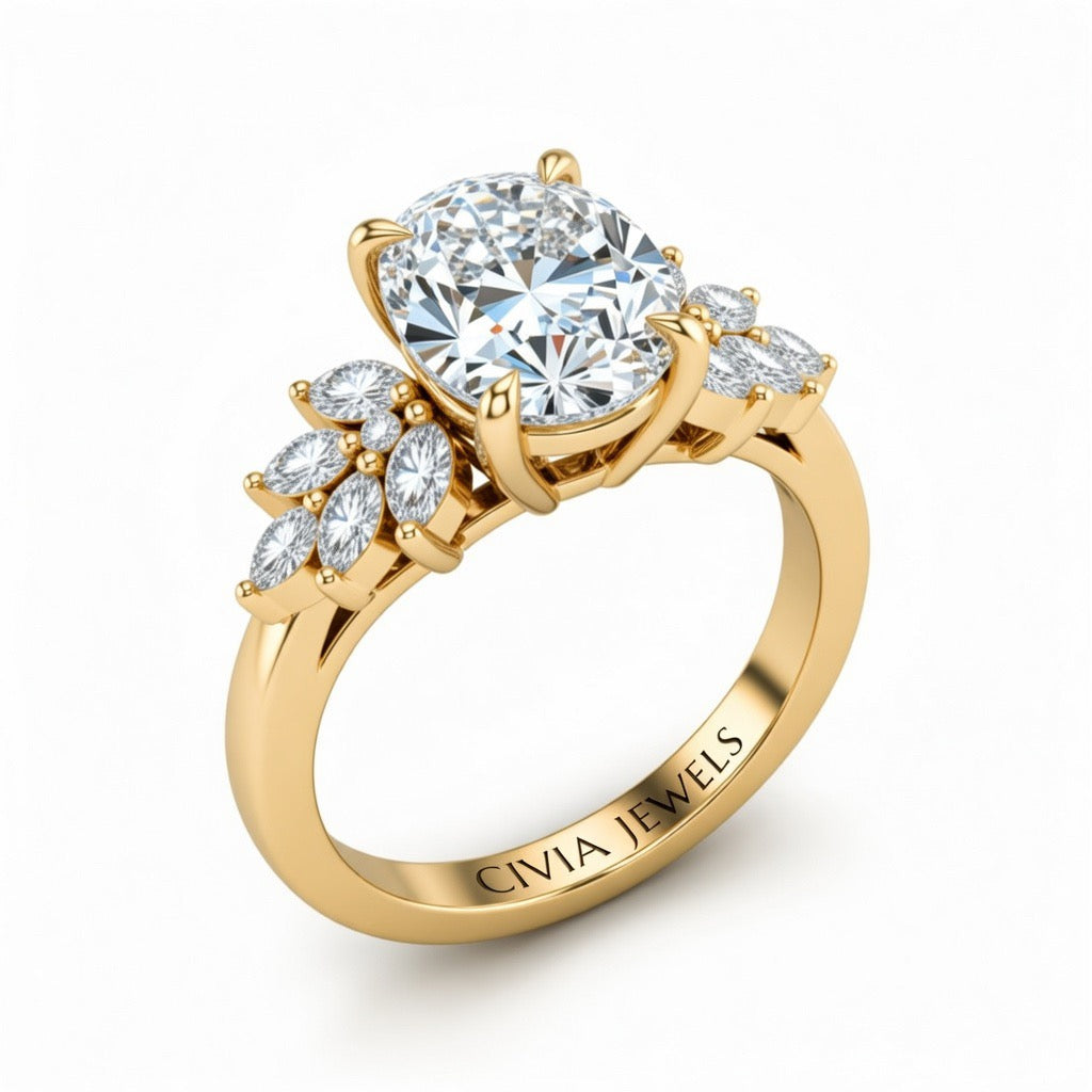 Yellow Gold Oval Cut Engagement Ring With Marquise Diamond Cluster Side Accents Yellow Gold Oval Cut Engagement Ring With Marquise Diamond Cluster Side Accents