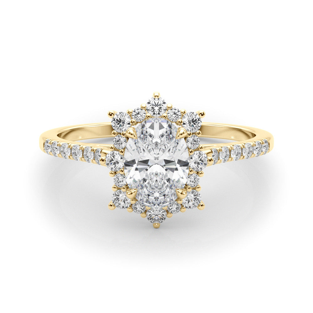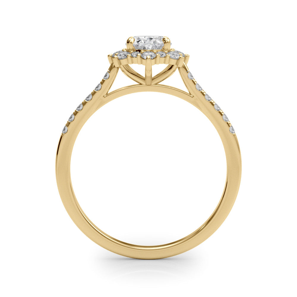 Yellow gold Oval Halo Diamond Ring with Pavé Band and Prong Setting