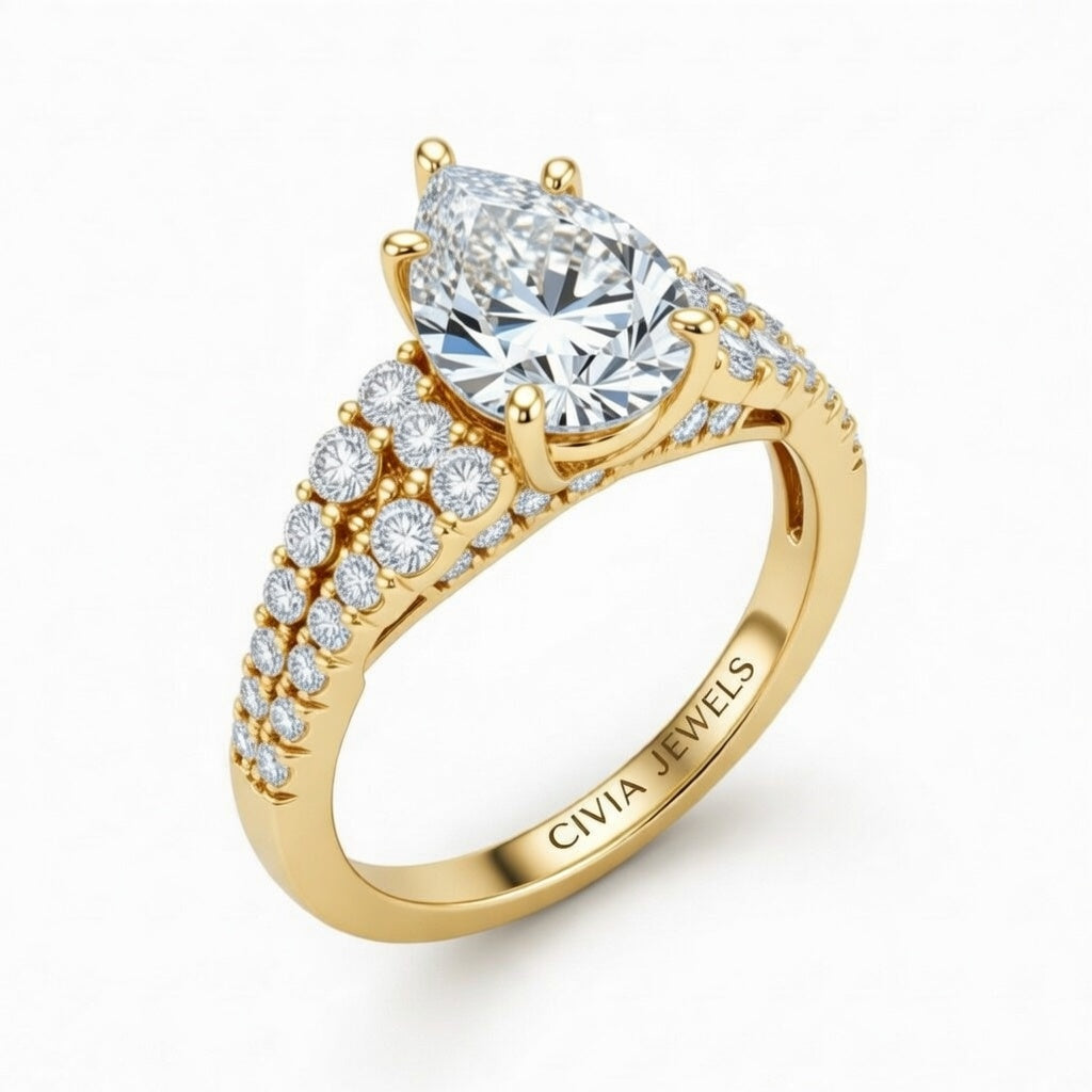 Yellow Gold Pear Cut Solitaire Engagement Ring With Pavé Diamond Band And Classic Four-Prong Setting