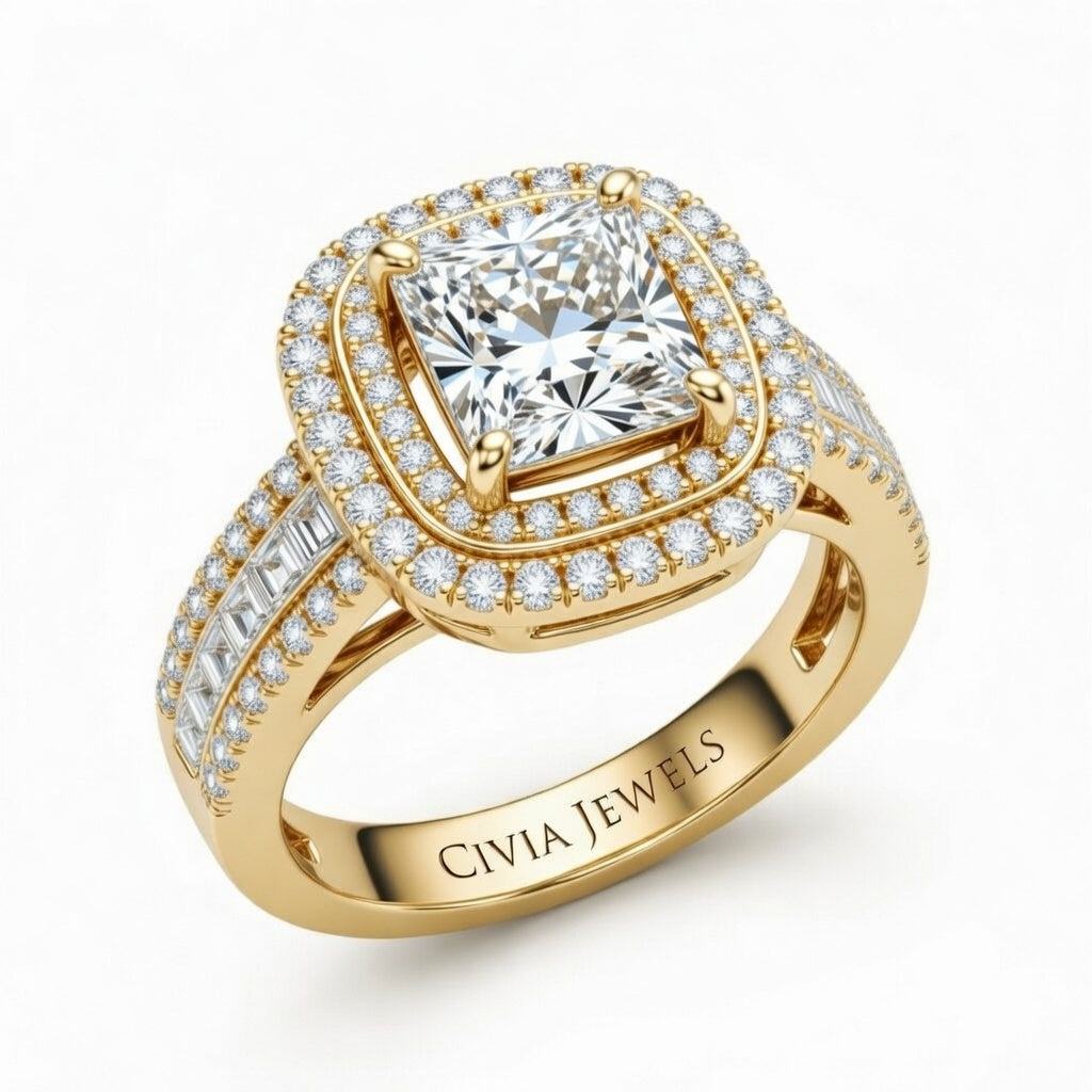 Yellow Gold Princess Cut Double Halo Engagement Ring With Diamond Baguette Accented Pavé Band Yellow Gold Princess Cut Double Halo Engagement Ring With Diamond Baguette Accented Pavé Band