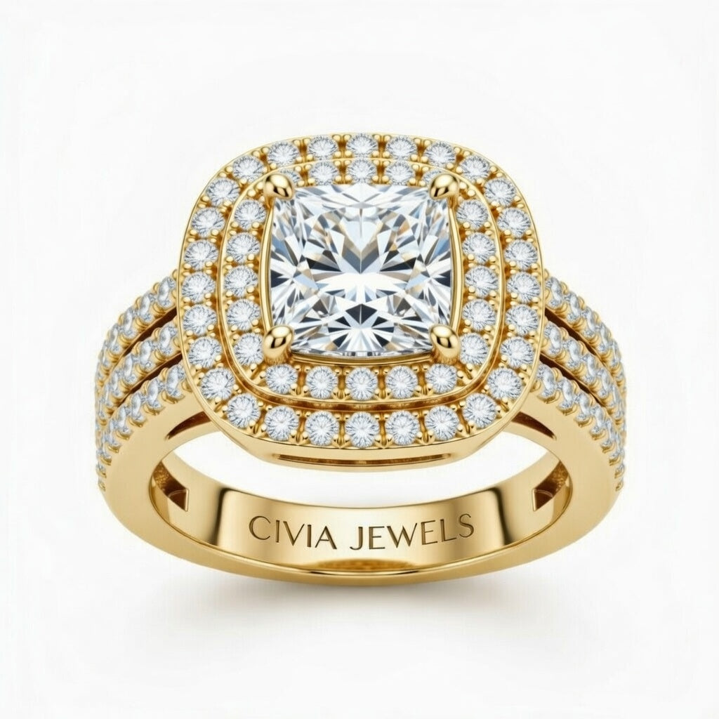 Yellow Gold Cushion Cut Double Halo Engagement Ring With Four Prong Setting And Diamond Pavé Split Band
