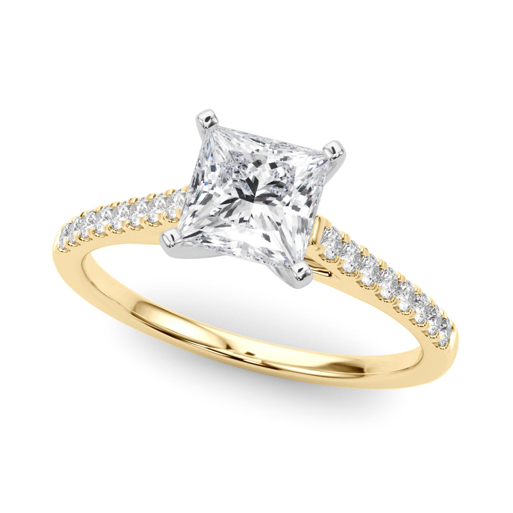 Yellow gold Princess Cut Solitaire Diamond Ring with Pave Band and Four-Prong Setting