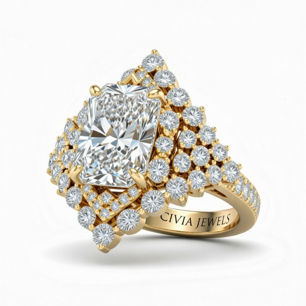 Yellow Gold Radiant Cut Engagement Ring With Diamond Cluster Sides, Double Halo Frame And Pavé Shank Yellow Gold Radiant Cut Engagement Ring With Diamond Cluster Sides, Double Halo Frame And Pavé Shank