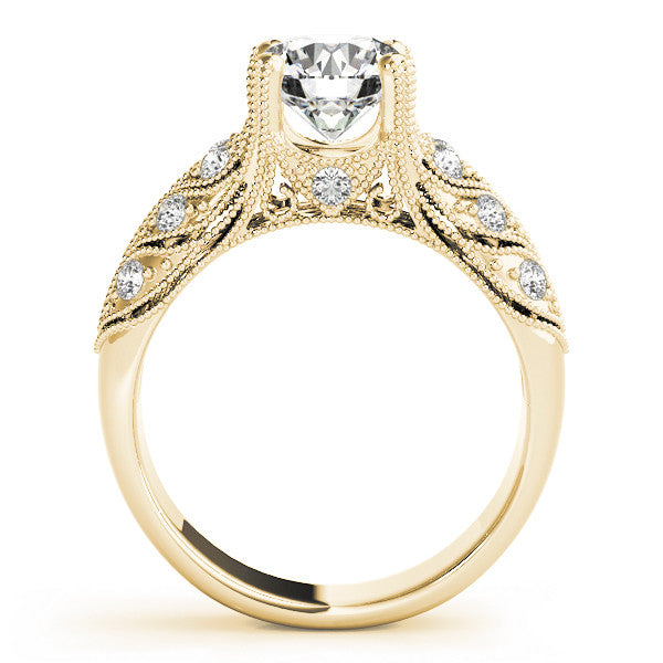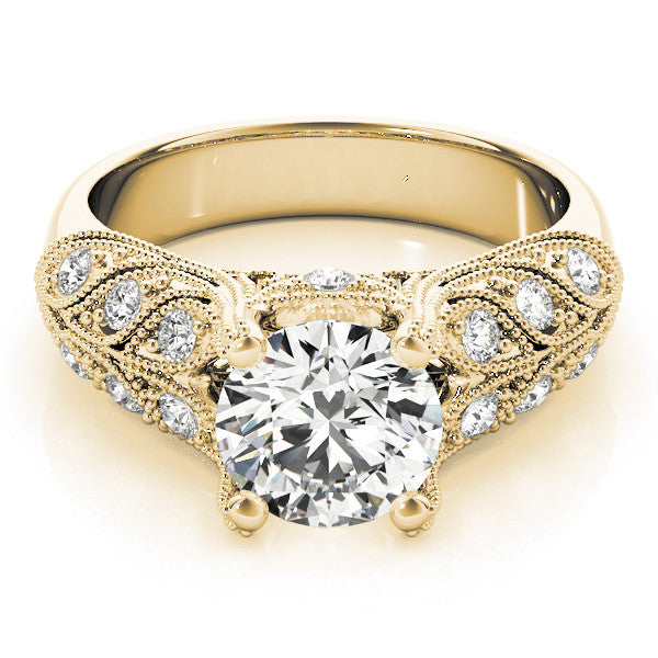 Yellow gold Round Cut Milgrain Pave Diamond Engagement Ring with Four-Prong Setting