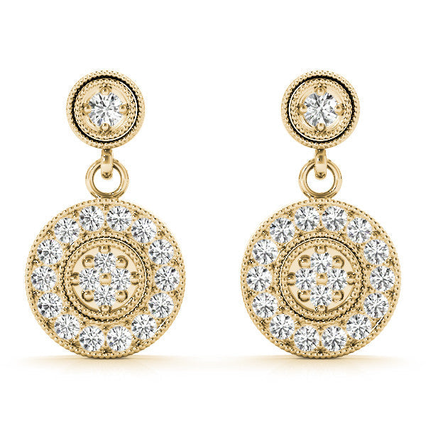 Yellow gold Round Halo Diamond Drop Earrings with Milgrain Bezel Setting