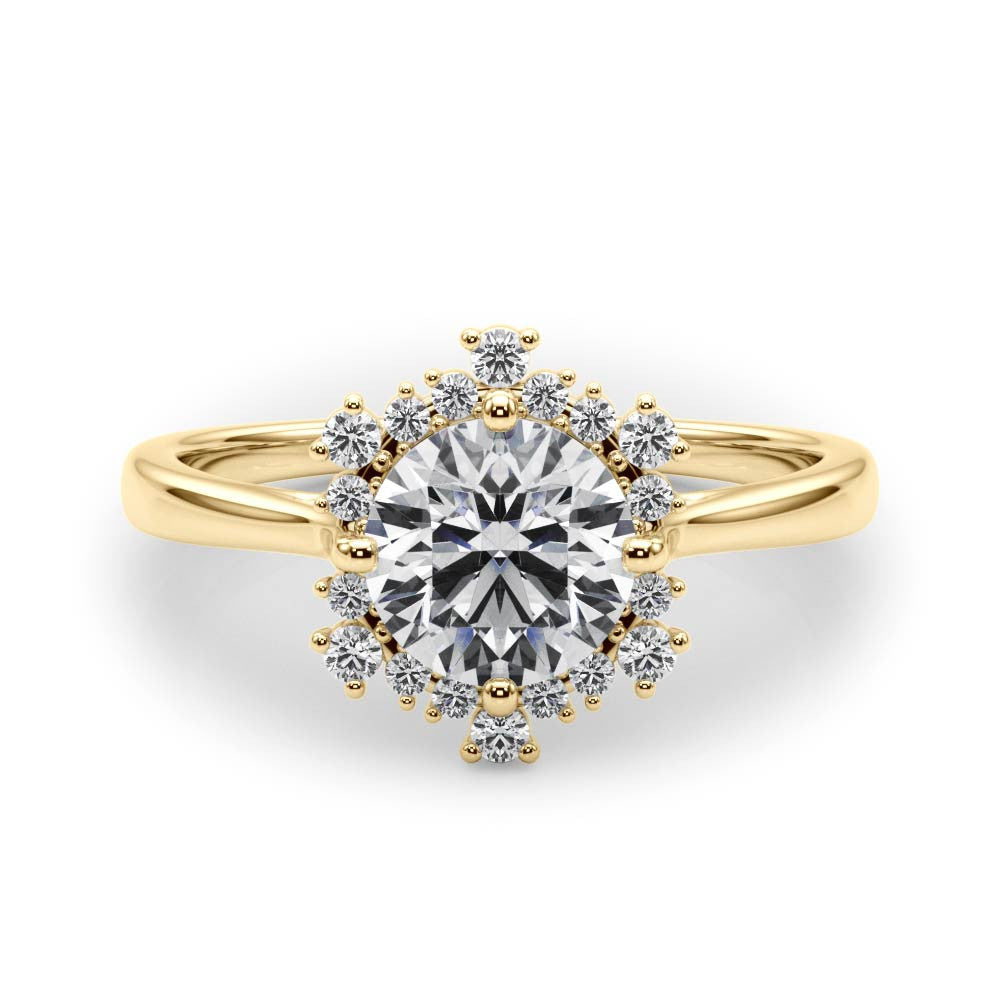Yellow gold Round Halo Diamond Solitaire with Pavé Band and Four-Prong Setting