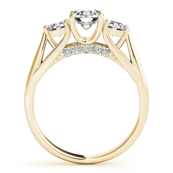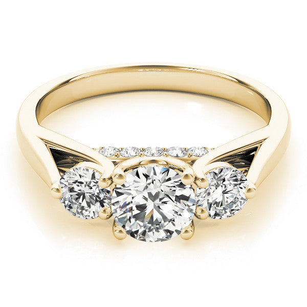 Yellow gold Three-Stone Round Diamond Engagement Ring with Pavé Band and Prong Setting